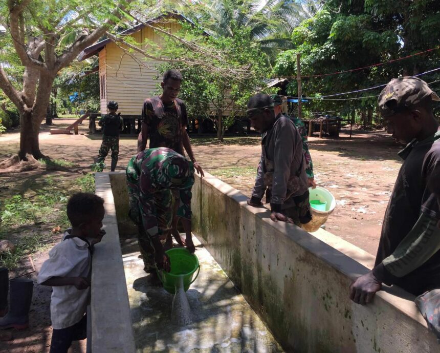 Tiffanews.co.id, Merauke – Prajurit Satgas Pamtas RI-PNG Yonif 511/DY melaksanakan karya bakti pembersihan bak penampungan air warga di Kampung Yakyu, Distrik Sota, Kabupaten Merauke, Senin (24/10/2022).