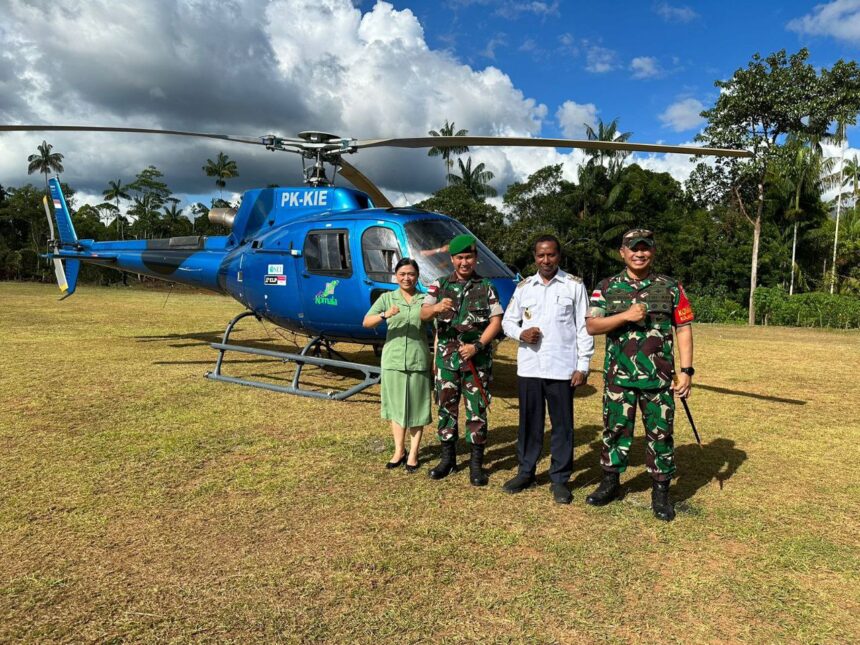 TIFFANEWS.CO.ID,- Menggunakan Helicopter Kumala Air PK – KIE PJ, Pj.Gubernur Papua Selatan Prof Dr. Ir. Apolo Safanpo, S.T., M.T., dan Danrem 174/ATW Brigjen TNI Agus Widodo, S.I.P., M.SI., meninjau Pos Satgas Pamtas RI-PNG Yonif 111/KB di wilayah Kabupaten Boven Digoel, Provinsi Papua Selatan. Sabtu (30/12/2023)
