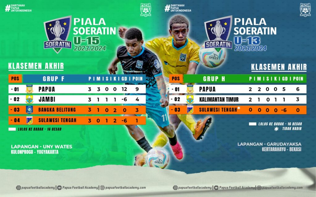 TIFFANEWS.CO.ID,- Dua tim yang mewakili Papua dari Papua Football Academy, yakni PFA U-13 dan U-15 sama-sama berhasil lolos ke fase grup turnamen Soeratin dan berhak melaju ke babak 16 besar.