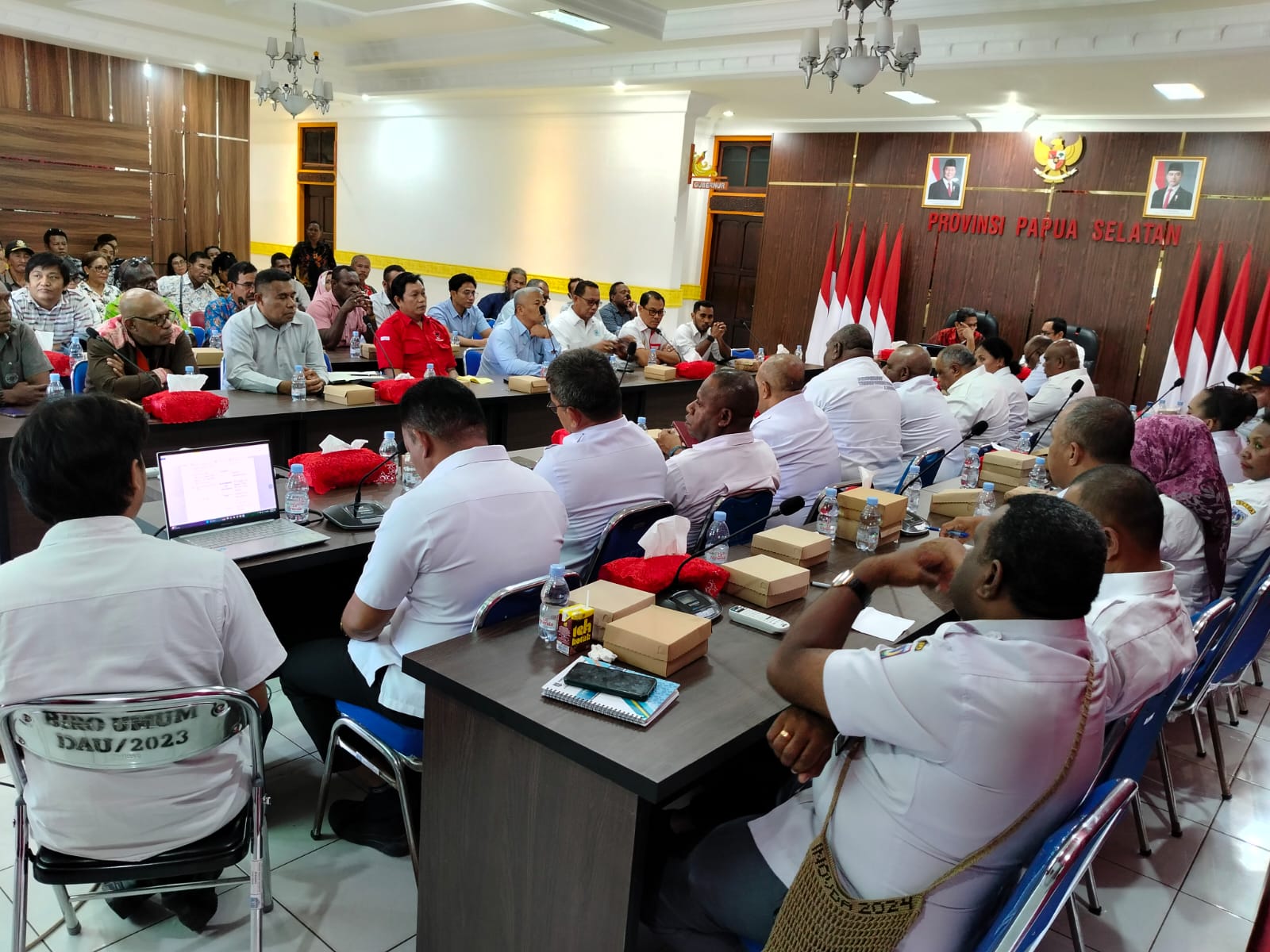 Rapat ini melibatkan berbagai pihak, termasuk kepala dinas di lingkungan Pemerintah Provinsi Papua Selatan, kepala biro, perwakilan partai koalisi pendukung, serta ketua-ketua tim sukses dan tim relawan.