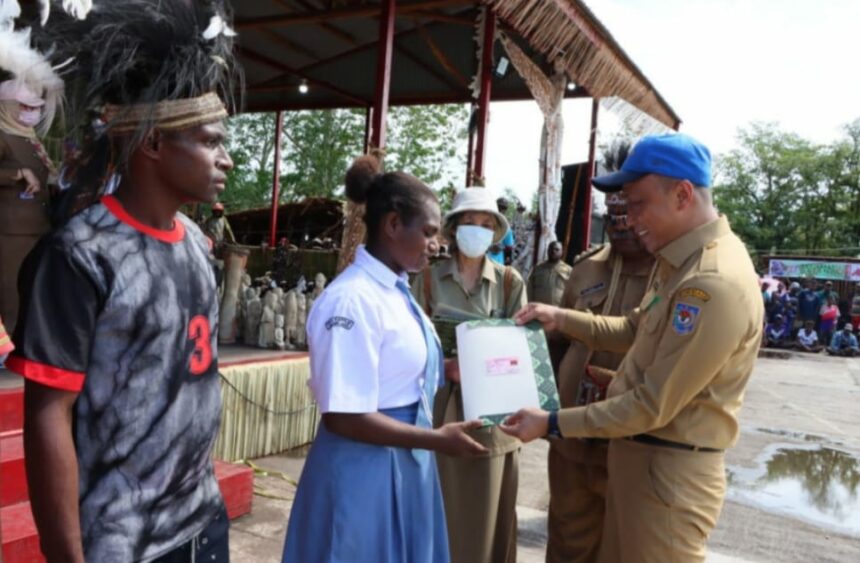 Dirjen Zudan didampingi Bupati Asmat Elisa Kambu berkenan memberikan sambutan singkat sekaligus menyerahkan dokumen kependudukan secara simbolis kepada penduduk berupa KTP-el, KTP Digital, akta lahir, KIA, dan KK.
