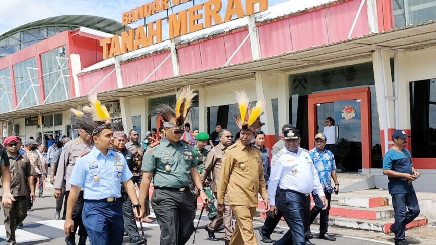 Kedatangan Pj Gubernur Apolo Safanpo bersama Danrem 174/ATW Brigjen TNI E. Reza Pahlevi S.E, Komandan Lanud JA Dimara Kolonel Pnb. Ferry Yunaldi , Kabinda, dan sejumlah Plt OPD di Bandar Udara Tanah Merah- Boven Digoel, disambut Komandan Kodim 1711/BVD Letkol Czi Agustinus Ressa Sala’pa, S.T., M.I.P dan Forkopimda Boven Digoel