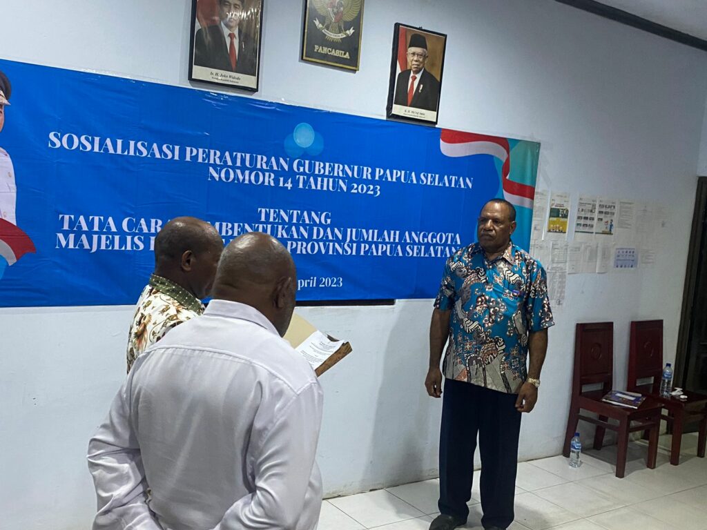 Paskalis Netep memimpin kegiatan sosialisasi yang digelar Panitia Pemilihan (Panpil) Anggota MRP Provinsi Papua Selatan dan diikuti oleh unsur masyarakat yang terdiri dari unsur adat, perempuan, dan agama.