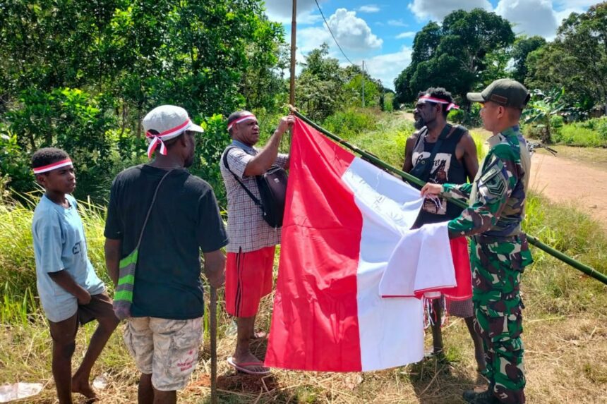 TIFFANEWS.CO.ID,- Sambut peringatan HUT Kemerdekaan Republik Indonesia Ke-78 Tahun 2023, Babinsa Koramil 1707-16/Sota Kodim 1707/Merauke Serda Harno bersama masyarakat Kampung Sota melaksanakan pemasangan bendera Merah Putih di Kampung Sota Distrik Sota, Kabupaten Merauke – Papua Selatan. Selasa (1/8).