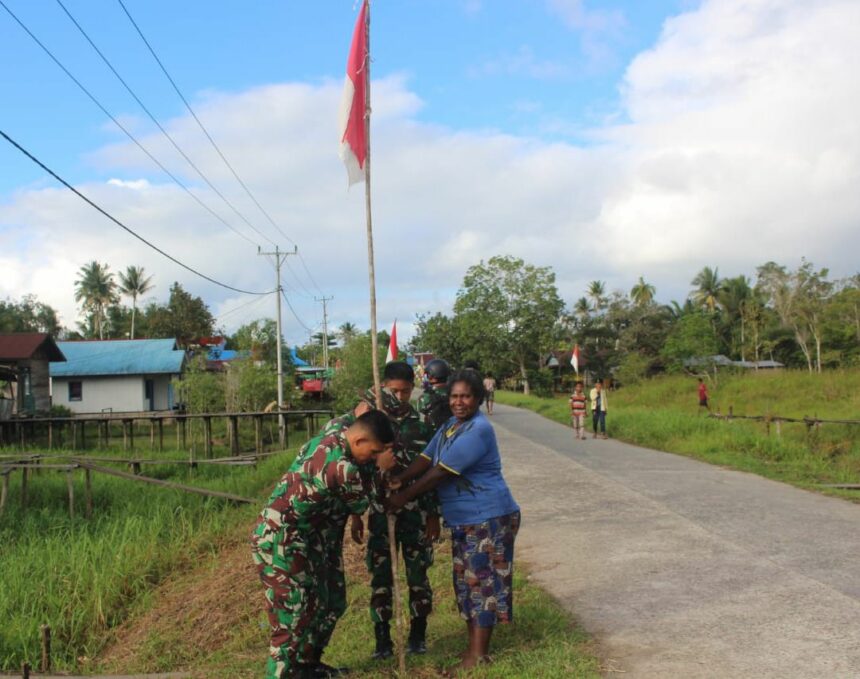 TIFFANEWS.CO.ID,- Sambut HUT kemerdekaan RI ke-78 tahun 2023, Satgas Yonif 125/Si’mbisa Pos Senggo bersama personel Koramil dan Polsek Citak Mitak, menyerukan dan mengingatkan warga untuk memasang bendera merah putih di Kampung Senggo, Distrik Citak Mitak, Kab. Asmat, Papua Selatan, Minggu (6/8/2023).