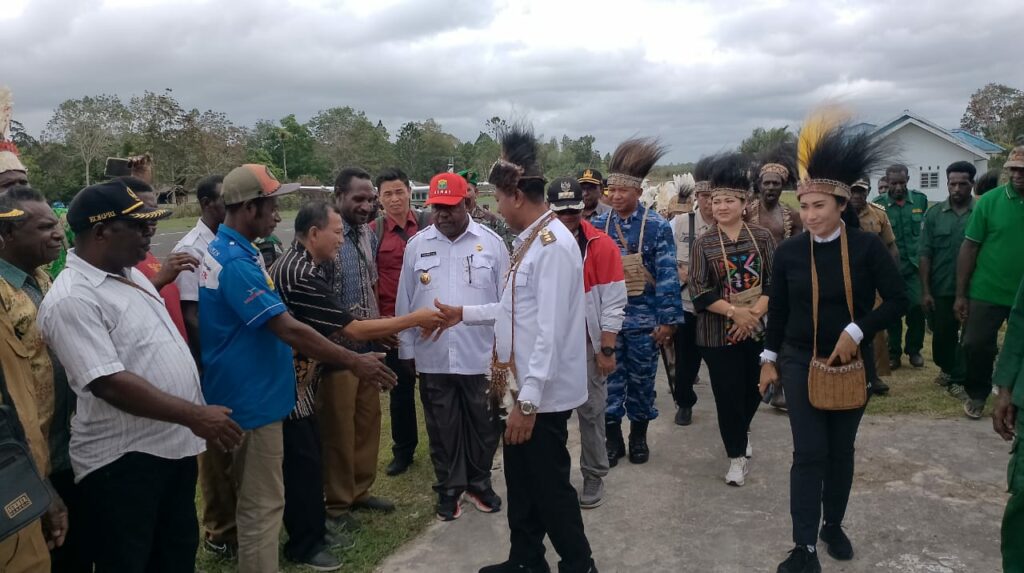 Kedatangan Pj Gubernur di Kampung Senggo disambut Bupati Asmat, Elisa Kambu, S.Sos dan Pj. Bupati Mappi Michael Gomar, S.STP., M.Si bersama masyarakat Senggo, Distrik Citak Mitak, Kabupaten Mappi, Jumat (15/9).