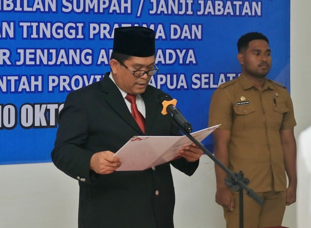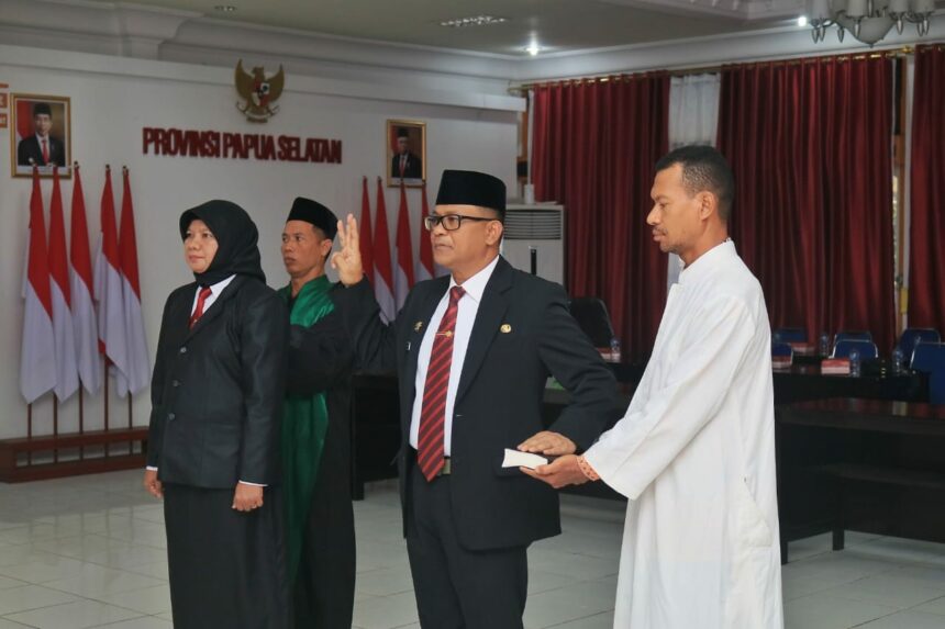 TIFFANEWS.CO.ID,- Pj. Sekretaris Daerah (Sekda) Provinsi Papua Selatan, Drs. Maddaremmeng, M.Si, melantik dan menetapkan Michael Ronny Gomar, S.STP., M.Si, yang akan menjabat sebagai Staf Ahli Gubernur Bidang Pengembangan Otonomi Khusus, dan Mariam, S.Sos, yang akan menjadi Auditor Jenjang Ahli Madya di lingkungan Pemerintah Provinsi Papua Selatan. Selasa (10/10).