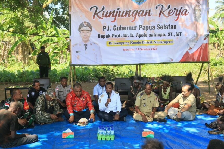 TIFFANEWS.CO.ID,- PJ Gubernur Papua Selatan, Prof. Dr. Ir. Apolo Safanpo, ST., MT., beserta rombongan melaksanakan kunjungan kerja (kunker) di Kampung Kondo, Distrik Naukenjerai, Kabupaten Merauke, Sabtu (14/10). Kampung Kondo merupakan kampung yang berada dekat Pos lintas batas Negara, perbatasan Indonesia dan Papua New Guinea