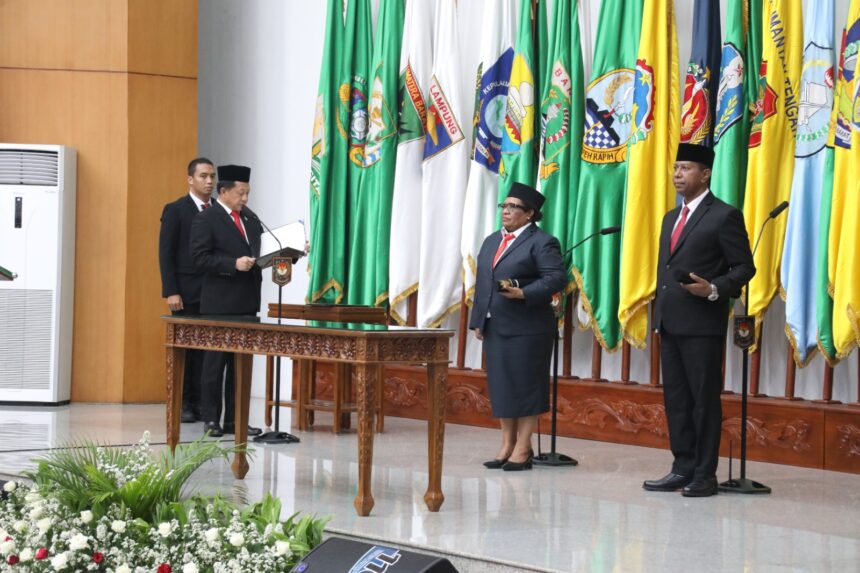 TIFFANEWS.CO.ID – Menteri Dalam Negeri (Mendagri) Muhammad Tito Karnavian melantik Sekretaris Daerah (Sekda) Provinsi Papua Selatan Apolo Safanpo dan Sekda Provinsi Papua Tengah Ribka Haluk. Pelantikan dihadiri para pejabat eselon 1 di lingkup Kementerian Dalam Negeri (Kemendagri) di Gedung Sasana Bhakti Praja (SBP) Kantor Pusat Kemendagri, Jakarta, Jumat (10/11).