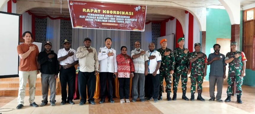 TIFFANEWS.CO.ID,- Komisi Pemilihan Umum (KPU) Kabupaten Dogiyai menggelar rapat koordinasi  bersama Pemerintah Kabupaten Dogiyai, Provinsi Papua Tengah dan Aparat keamanan (TNI/POLRI) terkait penentuan lokasi pemasangan alat peraga kampanye (APK) di Aula Koteka Moge Moanemani, Kabupaten Dogiyai, Jumat (24/11/2023).
