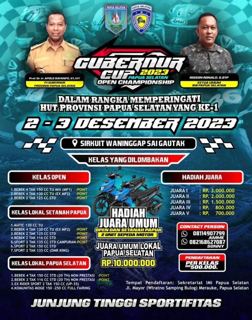TIFFANEWS.CO.ID,- Ikatan Motor Indonesia (IMI) Provinsi Papua Selatan akan menyelenggarakan lomba balap motor “Road Race Gubernur Cup 1 Papua Selatan” di Sirkuit Waninggap Sai Gautak, Distrik Tanah Miring, Kabupaten Merauke, Papua Selatan.
