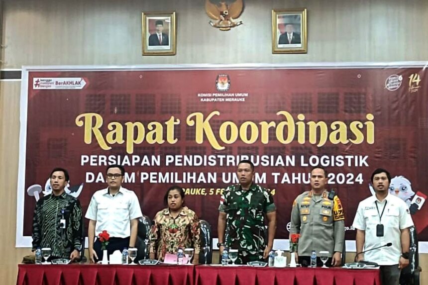TIFFANEWS.CO.ID,- Komandan Kodim 1707/Merauke Letkol Inf Bayu Kriswandito, S.Hub. Int., M.H.I. mengikuti rapat koordinasi persiapan pendistribusian logistik Pemilu 2024 KPU Kabupaten Merauke di Hotel Halogen Jln. Brawijaya Distrik Merauke Kabupaten Merauke – Papua Selatan Senin (5 /2/ 2024).