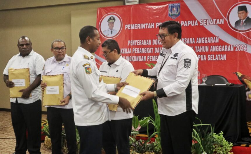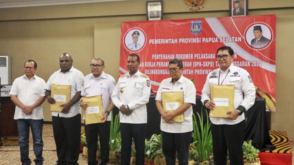 TIFFANEWS.CO.ID,- Penjabat (Pj) Gubernur Papua Selatan, Prof. Dr. Ir. Apolo Safanpo, ST., MT.,menyerahkan Dokumen Pelaksana Anggaran Satuan Perangkat Kerja Daerah (DPA-SKPD) Tahun 2024 kepada Pimpinan SKPD di Lingkungan Pemerintah Provinsi Papua Selatan, Rabu (28/2/2024).