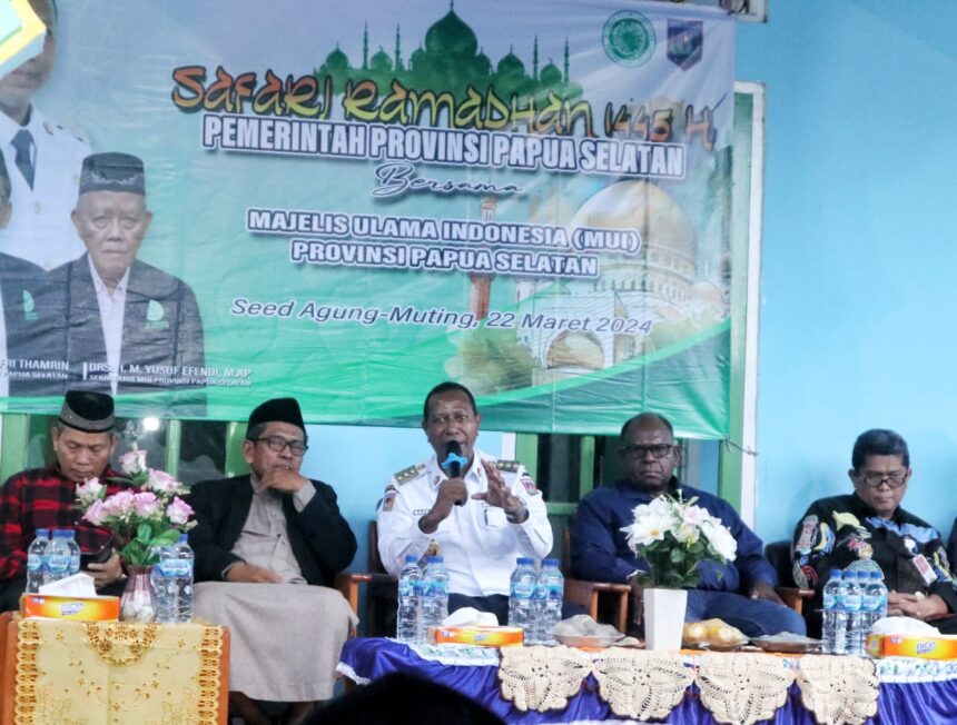 TIFFANEWS.CO.ID – Penjabat (Pj) Gubernur Papua Selatan, Prof. Dr. Ir. Apolo Safanpo, ST., MT., menjelaskan perkembangan Pemprov Papua Selatan menuju Pemerintahan Definitif dalam kegiatan Safari Ramadhan Tahun 2024 di Distrik Muting, Merauke, Ibukota Papua Selatan pada Jumat (22/3/2024).