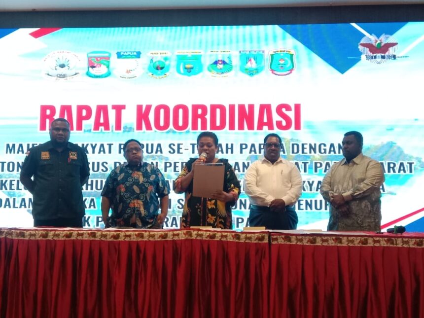 Dalam rapat koordinasi 6 Majelis Rakyat Papua bersama dua fraksi pengangkatan perwakilan OAP di lembaga legislatif yang berlangsung di ruang meeting Hotel Rylich Panorama, Kampung Baru, Kota Sorong, Provinsi Papua Barat Daya, Kamis (28/3/2024) telah menyepakati rekomendasi yang berpihak kepada kepentingan Orang Asli Papua.