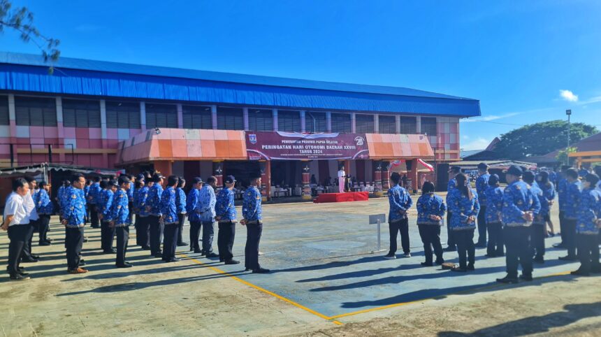 TIFFANEWS.CO.ID – Pj. Gubernur Papua Selatan, Prof. Dr. Ir. Apolo Safanpo, ST., MT., IPM memimpin upacara peringatan Hari Otonomi Daerah (Otda) Ke 28 di GOR Hiad Sai, Merauke, Kamis (25/4_2034).