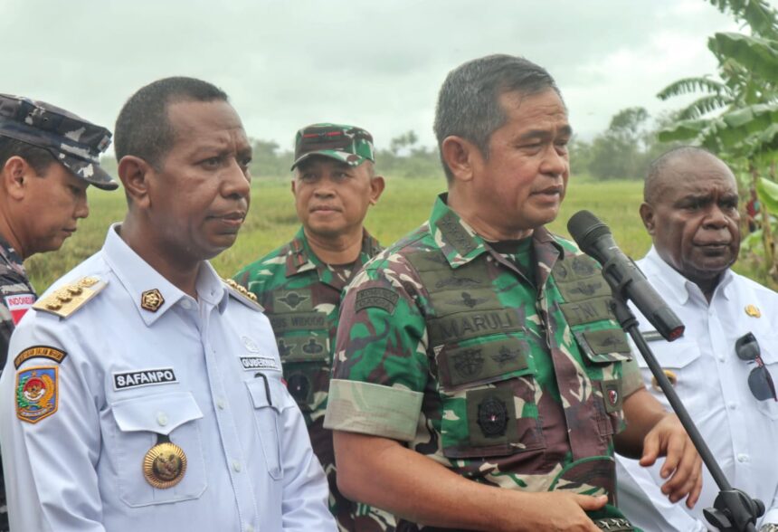 TIFFANEWS.CO.ID – Penjabat (Pj) Gubernur Provinsi Papua Selatan, Prof. Dr. Ir. Apolo Safanpo, ST., MT., IPM., terlihat mendampingi Kepala Staf TNI Angkatan Darat (Kasad), Jenderal TNI Maruli Simanjuntak pada Panen Raya dalam rangka Ketahanan Pangan di Kampung Ivimahad, Distrik Kurik, Merauke.