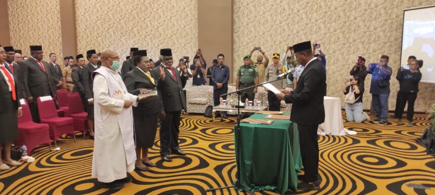 TIFFANEWS.CO.ID – Dua unsur pimpinan Majelis Rakyat Papua (MRP) Papua Selatan periode 2023-2028 resmi dilantik oleh Penjabat (Pj) Gubernur Papua Selatan, Apolo Safanpo, dalam sebuah acara di Merauke, Selasa (14/5/2024).