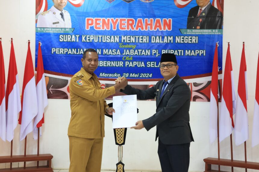 TIFFANEWS.CO.ID – Penjabat (Pj) Gubernur Papua Selatan, Prof. Dr. Ir. Apolo Safanpo, ST., MT., secara resmi menyerahkan Surat Keputusan Menteri Dalam Negeri tentang Perpanjangan Masa Jabatan kepada Pj. Bupati Kabupaten Mappi, Michael Rooney Gomar, S.STP., di Kantor Gubernur pada Selasa (28/5/2024).