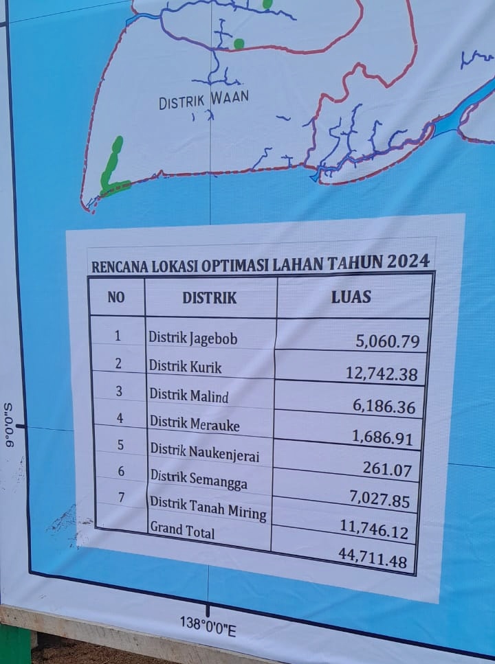 Menurut data yang dirilis, sebagian besar lahan yang dioptimalkan terdapat di Distrik Kurik, dengan luas mencapai 12.742 hektar, diikuti oleh Distrik Tanah Miring dengan 11.746 hektar.