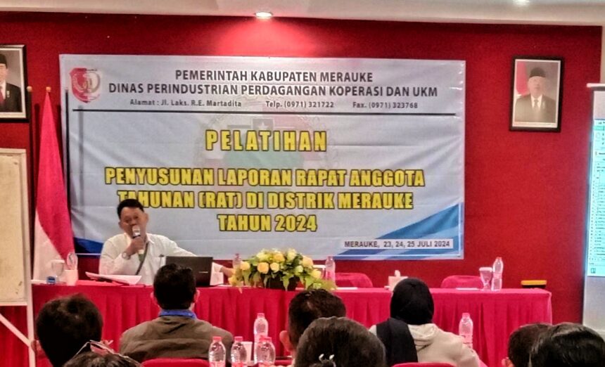 TIFFANEWS.CO.ID – Dinas Perindustrian Perdagangan Koperasi dan UKM Kabupaten Merauke mengadakan pelatihan penyusunan Laporan Rapat Anggota Tahunan (RAT) di Distrik Merauke selama tiga hari dari tanggal 23 – 25 Juli 2024.