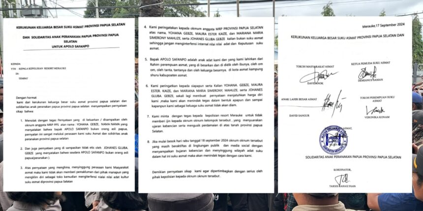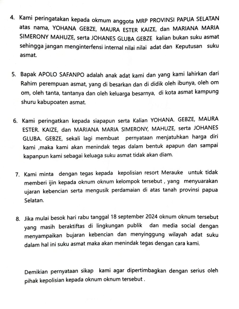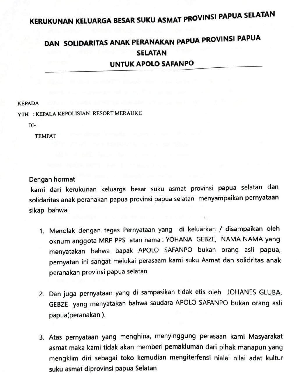 Surat tersebut secara tegas menyatakan, “Bapak Apolo Safanpo adalah anak adat kami, yang lahir dari rahim perempuan Asmat dan dibesarkan oleh ibunya, om-om, tanta-tantanya, serta keluarga besarnya di Kota Asmat, Kampung Syuru, Kabupaten Asmat.”