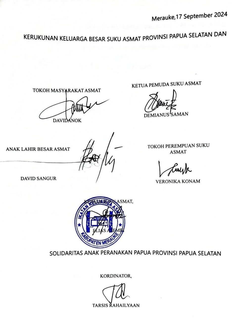 Dalam sebuah surat resmi yang dikeluarkan pada 17 September 2024, kerukunan keluarga Asmat menegaskan bahwa mereka tidak akan mentolerir pihak mana pun yang berupaya mengintervensi nilai-nilai adat dan budaya yang telah mereka jaga selama ini.