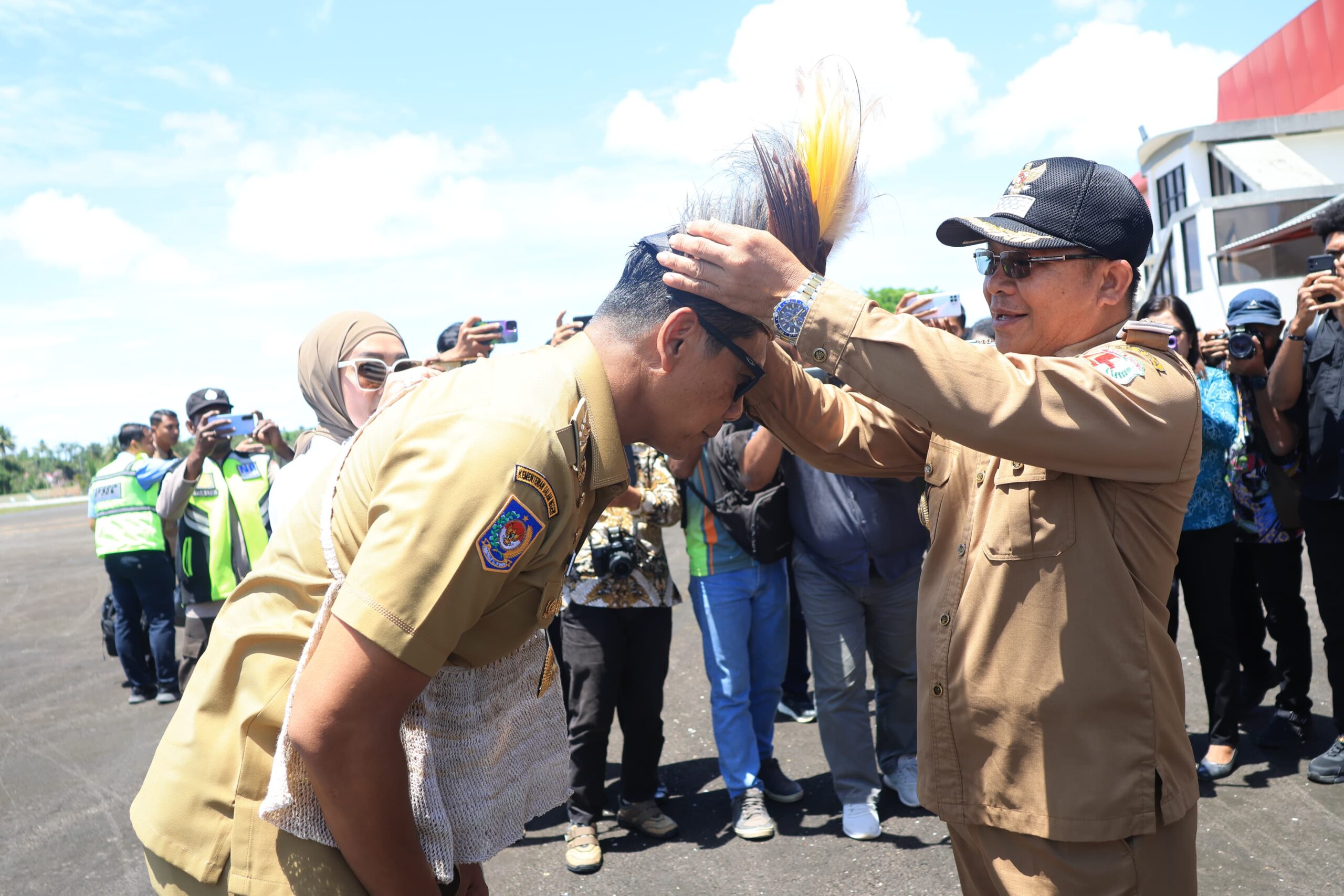 Plt Bupati Boven Digoel Lexi Romel Wagiu menyambut kedatangan dengan mengenakan makota kepala dan noken ke Pj Gubernur dan istri. Selain itu, kedatangan rombongan disambut dengan tari-tarian adat setempat.