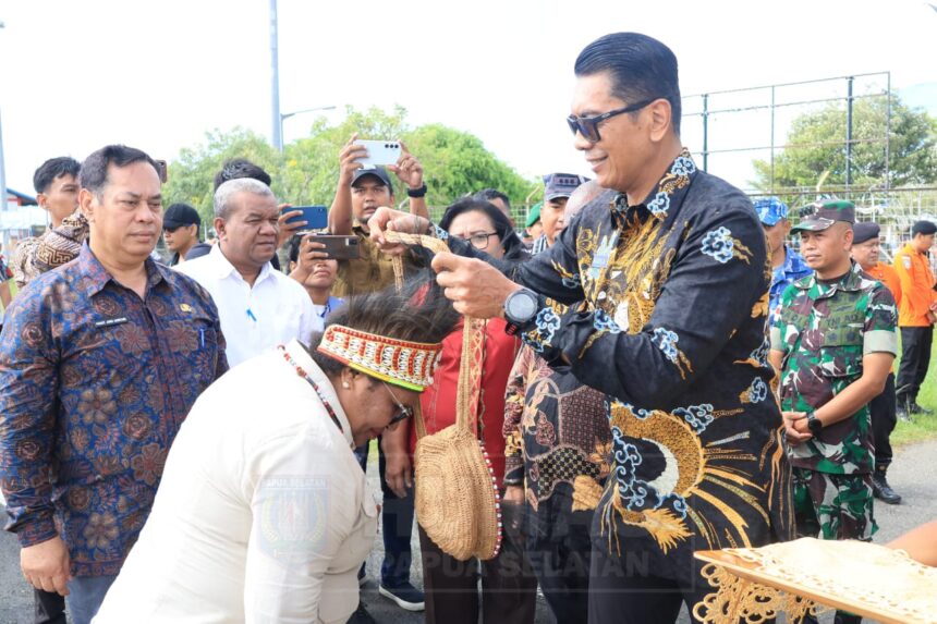 Acara penyambutan berlangsung di VIP Room Bandara Mopah Merauke, di mana Pj Gubernur Rudy Sufahriadi memberikan penghormatan dengan mengalungkan kalung khas Papua, memakaikan mahkota kepala, serta Noken khas Asmat kepada Wamendagri Ribka Haluk.