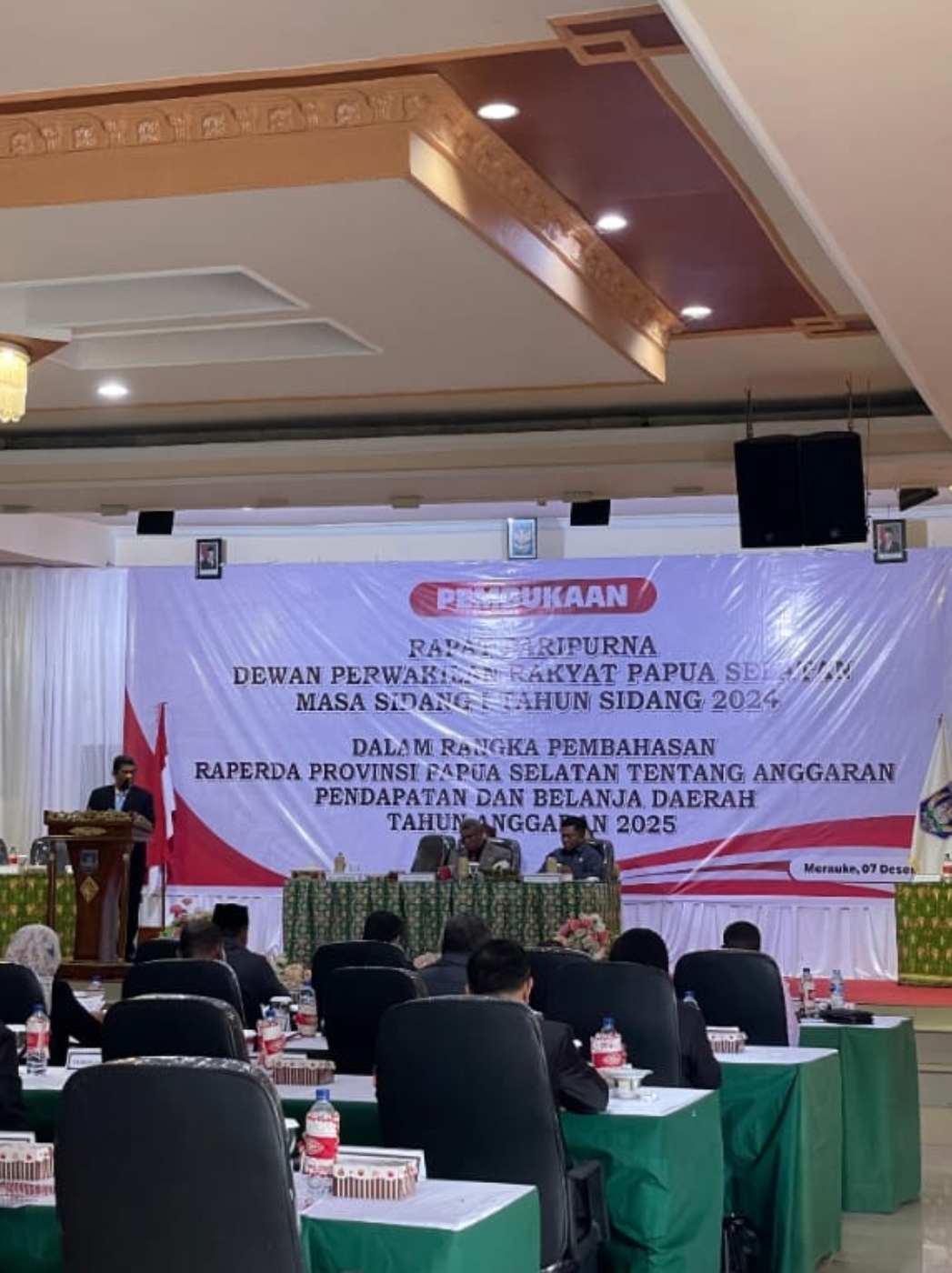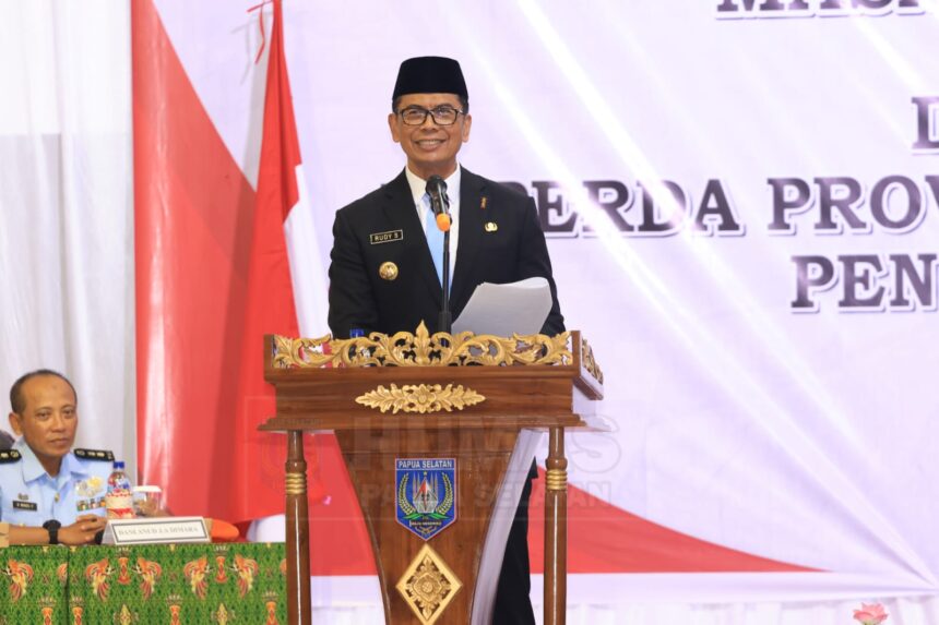 TIFFANEWS.CO.ID – Pj Gubernur Papua Selatan, Sufahriadi, memberikan tanggapan terhadap pendapat fraksi-fraksi DPR Papua Selatan mengenai Peraturan Daerah (Perda) Anggaran Pendapatan dan Belanja Daerah (APBD) Tahun 2025. Jawaban gubernur tersebut dibacakan oleh Pj Sekda, Maddaremeng, dalam rapat pembahasan APBD yang berlangsung pada sidang paripurna DPR, Sabtu (7/12/2024).