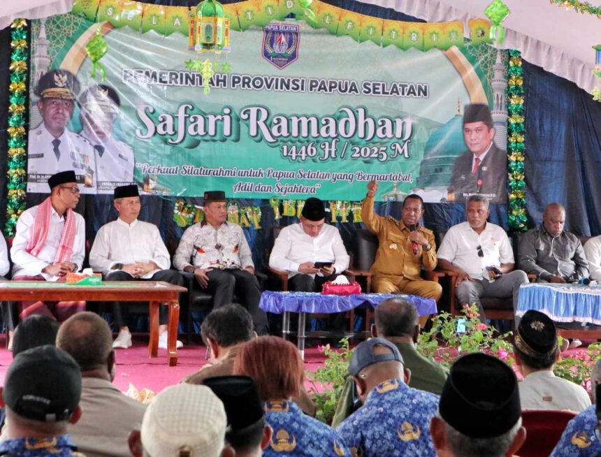 TIFFANEWS.CO.ID – Gubernur Papua Selatan, Apolo Safanpo, memberikan sambutan penuh semangat dalam acara Safari Ramadhan yang digelar di Kampung Waninggap Miraf, Distrik Tanah Miring, Kabupaten Merauke, pada Senin (17/3/2025). Dalam kesempatan ini, Gubernur menyampaikan pesan penting mengenai dua program utama yang menjadi fokus pemerintahan Presiden Prabowo Subianto, yaitu swasembada pangan dan swasembada energi.