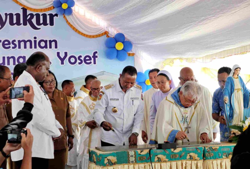 Apolo Safanpo, Gubernur Papua Selatan dan Uskup Agung Merauke, Mgr. Petrus Canisius Mandagi menandatangani Prasasti Peresmian Gedung di RSBP Merauke. (Foto: tiffanews.co.id/RON)