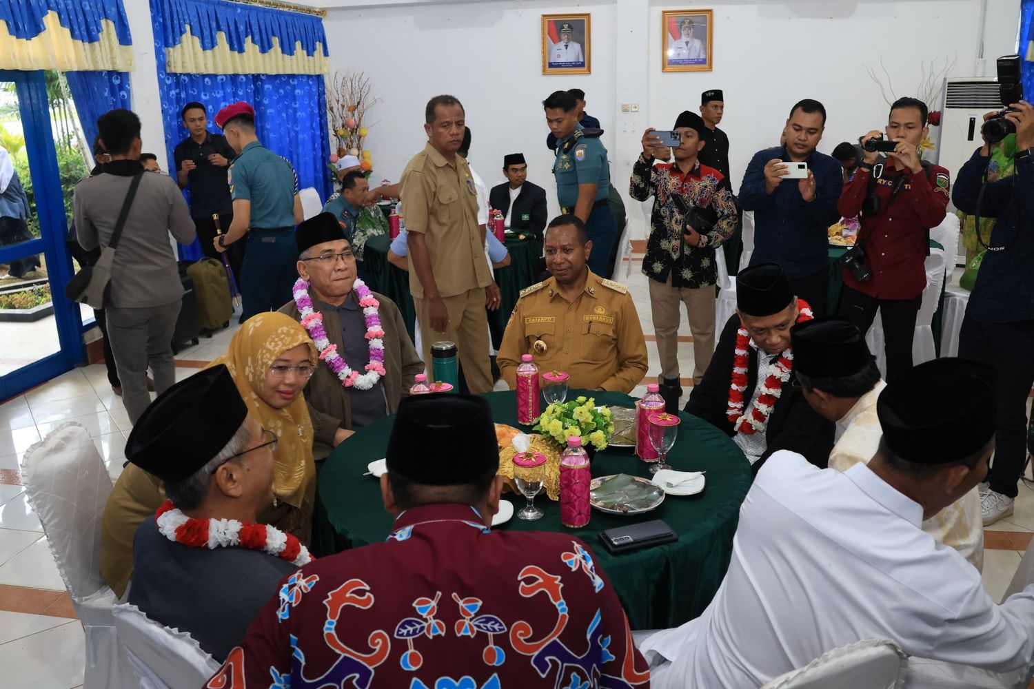 TIFFANEWS.CO.ID – Gubernur Papua Selatan (Papsel), Apolo Safanpo, bersama Wakil Bupati Merauke, Fauzun Nihayah, menyambut kedatangan Ketua Umum (Ketum) Pengurus Besar Nahdlatul Ulama (PBNU), KH Cholil Staquf, beserta rombongan di Bandara Mopah Merauke, Senin (5/5/2025).