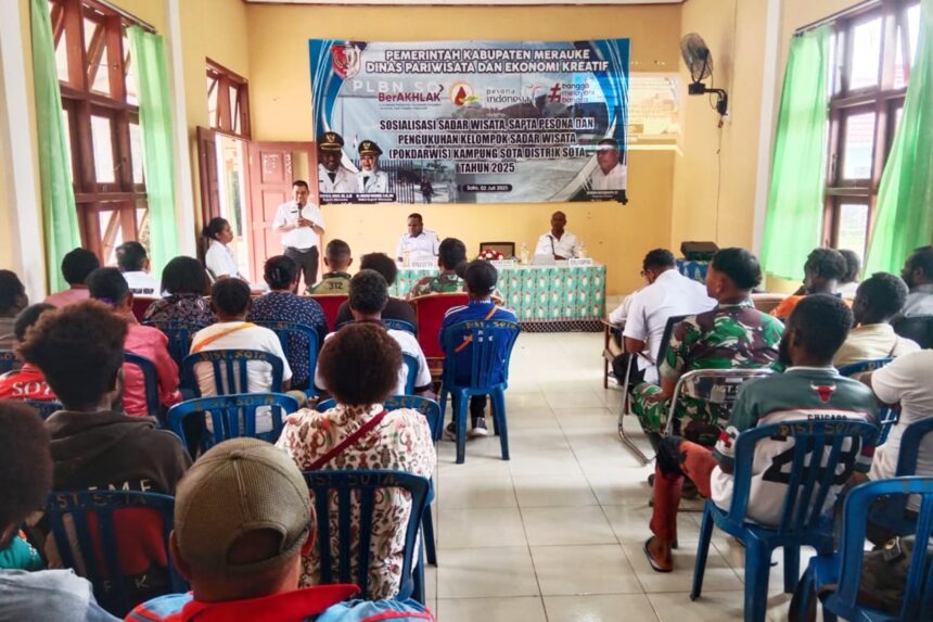 TIFFANEWS.CO.ID,– Semangat membangun potensi wisata lokal terus digalakkan di wilayah perbatasan. Bertempat di Aula Distrik Kampung Sota, Kabupaten Merauke, Provinsi Papua Selatan, Babinsa Koramil 1707-06/Sota Kodim 1707/Merauke, Serma Dwi Surya dan Serda Jembar, menghadiri kegiatan Sosialisasi Sadar Wisata, Sapta Pesona, serta pengukuhan Kelompok Sadar Wisata (Pokdarwis) Kampung Sota, Rabu (2/7/2025).