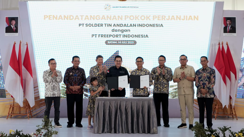 TIFFANEWS.CO.ID,- Presiden Direktur PT Freeport Indonesia (PTFI) Tony Wenas dan Direktur PT Solder Tin Andalan Indonesia (Stania) An Sudarno menandatangani Heads of Agreement (HoA) jual beli timbal dan perak yang dihasilkan dari fasilitas Precious Metal Refinery (PMR) PTFI. Penandatanganan ini disaksikan Wakil Menteri Investasi dan Hilirisasi Todotua Pasaribu, dan Direktur Utama PT Arsari Tambang Aryo Djojohadikusumo di Batam, Kamis, 10 Juli 2025.
