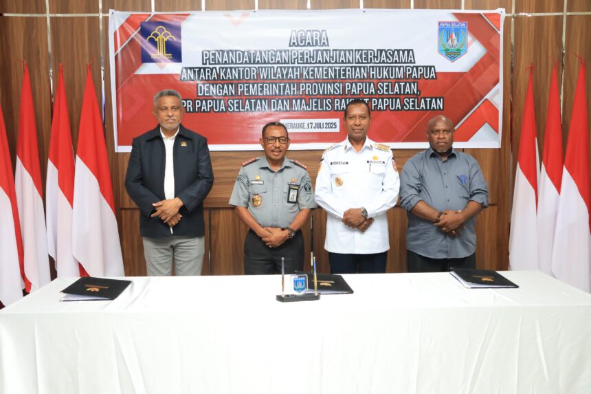 TIFFANEWS.CO.ID – Dalam upaya mempercepat proses penyusunan regulasi daerah, Pemerintah Provinsi Papua Selatan resmi menjalin kerja sama dengan Kementerian Hukum dan HAM (Kemenkumham) melalui Kantor Wilayah Papua. Penandatanganan perjanjian kerja sama tersebut berlangsung di ruang rapat Kantor Gubernur Papua Selatan pada Kamis (17/7/2025).