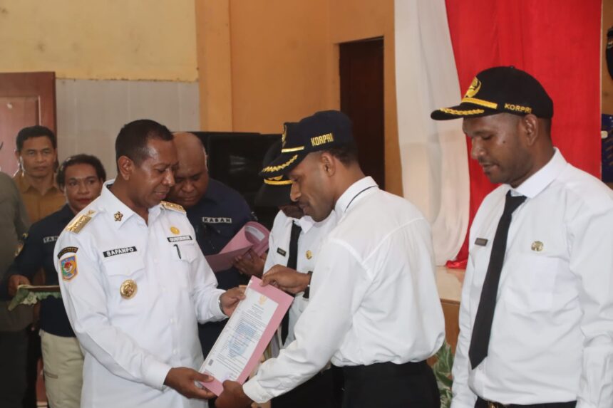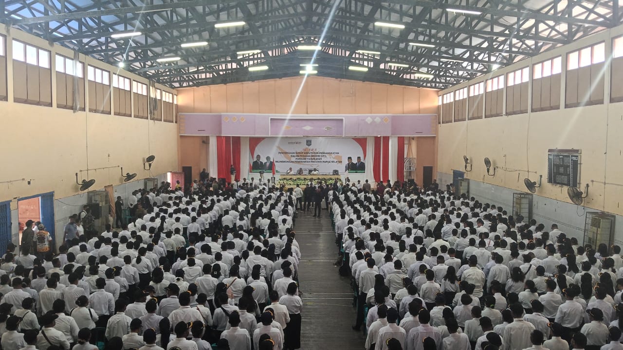 TIFFANEWS.CO.ID – Sebanyak 794 Calon Pegawai Negeri Sipil (CPNS) formasi 2024 menerima Surat Keputusan (SK) penempatan yang diserahkan secara simbolis oleh Gubernur Papua Selatan, Apolo Safanpo, di Gedung Olahraga (GOR) Hiad Sai Merauke, Jumat (18/7/2025).