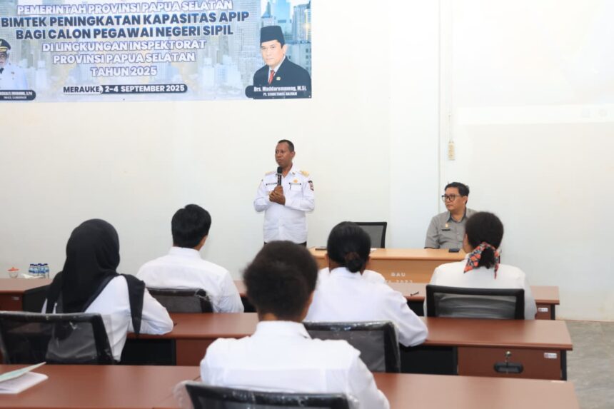 Pesan itu ia sampaikan saat membuka Bimbingan Teknis (Bimtek) Peningkatan Kapasitas APIP bagi Calon Pegawai Negeri Sipil (CASN) di Aula Inspektorat Papua Selatan, Selasa (2/9/2025). Kegiatan berlangsung selama tiga hari, hingga Kamis (4/9/2025).