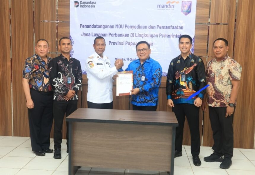 TIFFANEWS.CO.ID – Pemerintah Provinsi (Pemprov) Papua Selatan menggandeng Bank Mandiri dalam kerja sama penyediaan jasa layanan perbankan. Penandatanganan Memorandum of Understanding (MoU) atau nota kesepahaman tersebut berlangsung di ruang rapat Kantor Gubernur Papua Selatan, Kamis (16/10/2025).