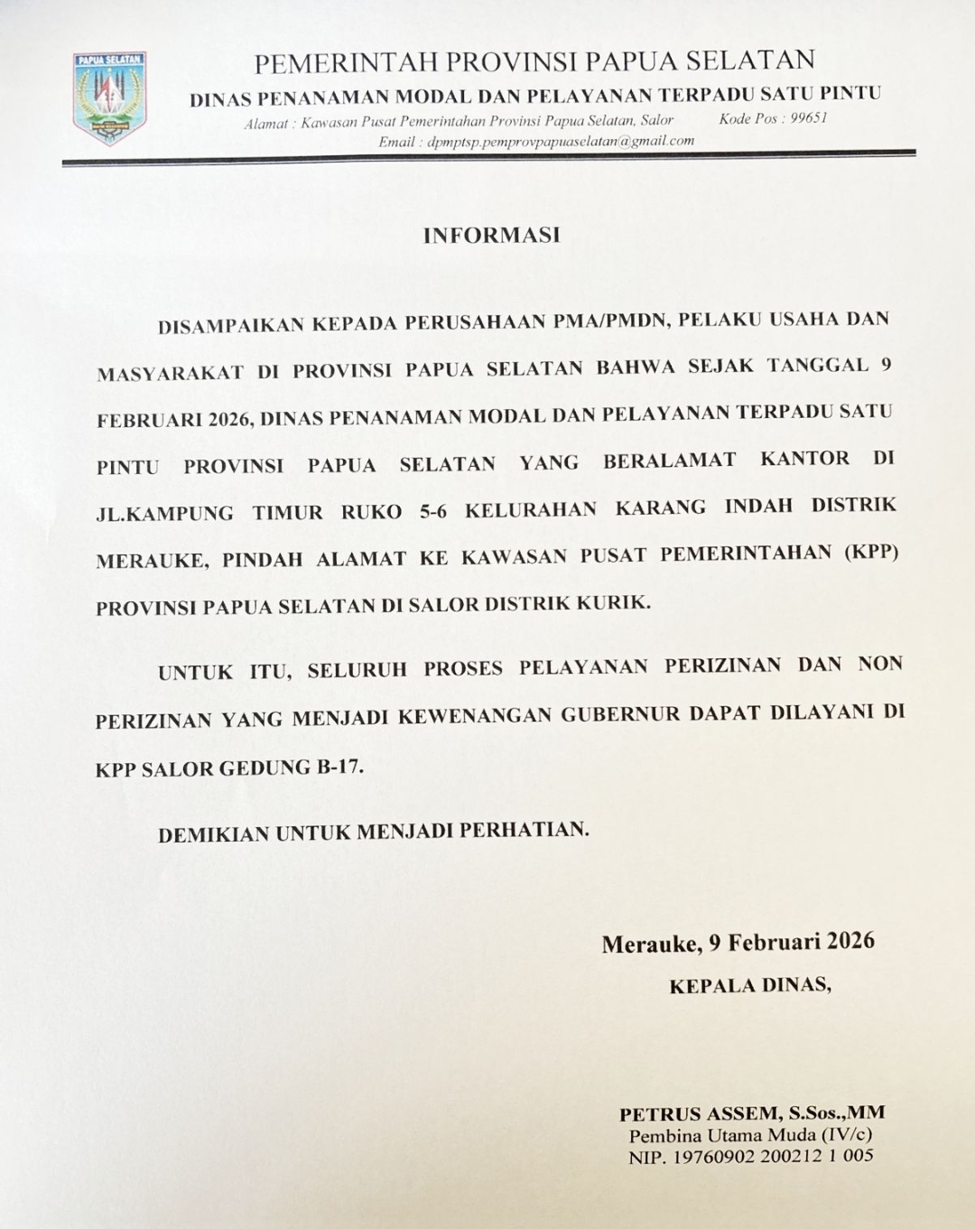 “Disampaikan kepada Perusahaan PMA/PMDN, pelaku usaha dan masyarakat di Provinsi Papua Selatan bahwa sejak tanggal 9 Februari 2026, Dinas Penanaman Modal dan Pelayanan Terpadu Satu Pintu Provinsi Papua Selatan yang beralamat kantor di Jl. Kampung Timur Ruko 5–6 Kelurahan Karang Indah Distrik Merauke, pindah alamat ke Kawasan Pusat Pemerintahan (KPP) Provinsi Papua Selatan di Salor Distrik Kurik.”