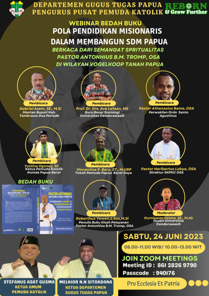 TIFFANEWS.CO.ID- Buku,”Pola Pendididikan Misionaris Dalam Membangun SDM Papua Berkaca Dari Semangat Spritualitas Pastor Anthonius B.M. Tromp OSA Di Wilayah Vogelkoop Tanah Papua.”didiskusikan melalui webinar oleh Departemen Gugus Tugas Papua, Pengurus Pusat Pemuda Katolik, Sabtu, (24/6).