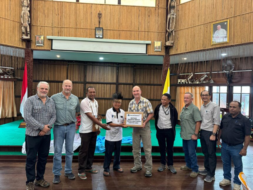 Executive Vice President (EVP) Technical Services PTFI Chris Zimmer menyerahkan bantuan bahan pangan untuk para seniman secara simbolis yang diterima oleh Uskup Agats Mgr. Aloysius Murwito di Kantor Keuskupan Agats, Selasa (8/10/2024).