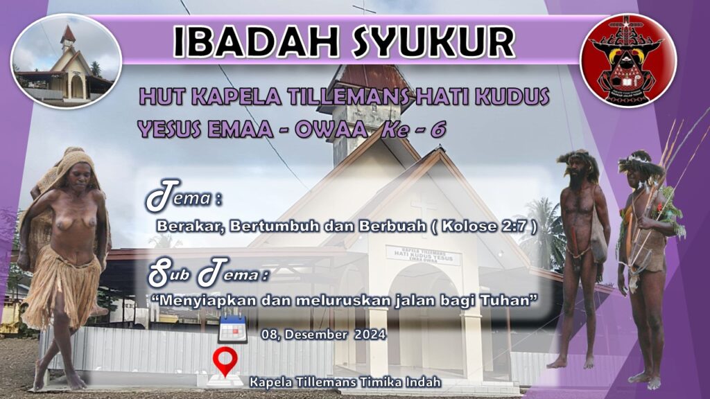 TIFFANEWS.CO.ID,- Misa bernuansa Suku Mee meriahkan perayaan ibadah syukur Hari Ulang Tahun (HUT) ke-6 Kapela Tillemans Hati Kudus Yesus Emaa, Paroki Katedral Tiga Raja Timika,Minggu, (9/12/2024).