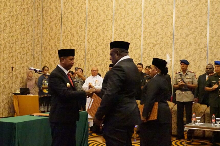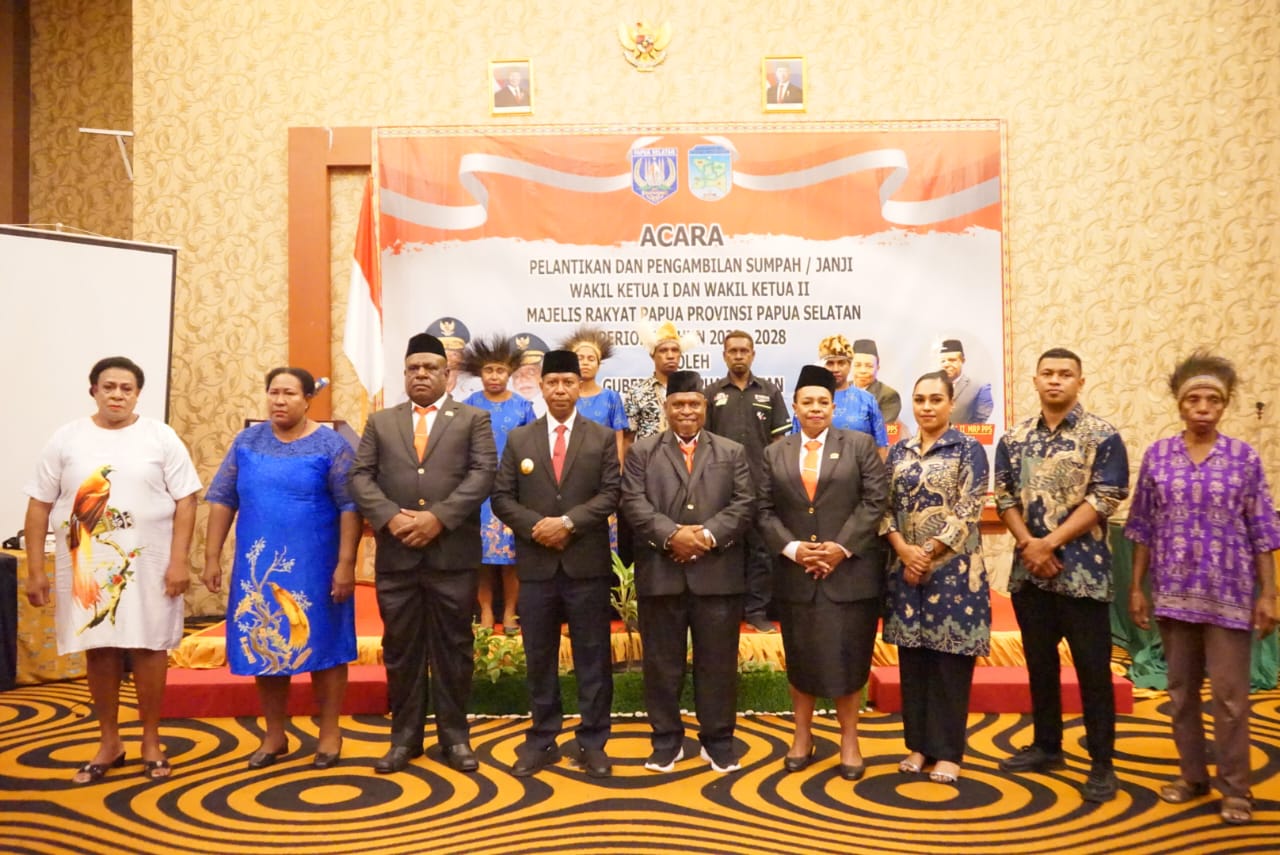 TIFFANEWS.CO.ID — Gubernur Papua Selatan, Apolo Safanpo, resmi melantik dua Wakil Ketua Majelis Rakyat Papua Selatan (MRPS) dalam sebuah upacara di Swiss-Belhotel Merauke, Kamis (31/7/2025).