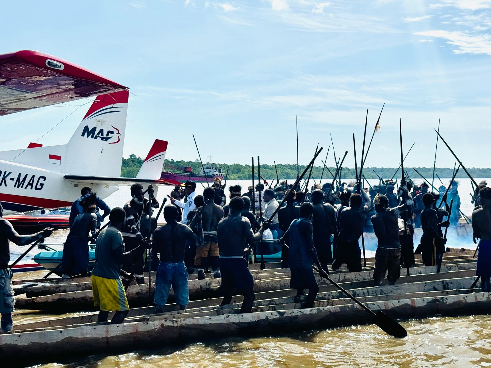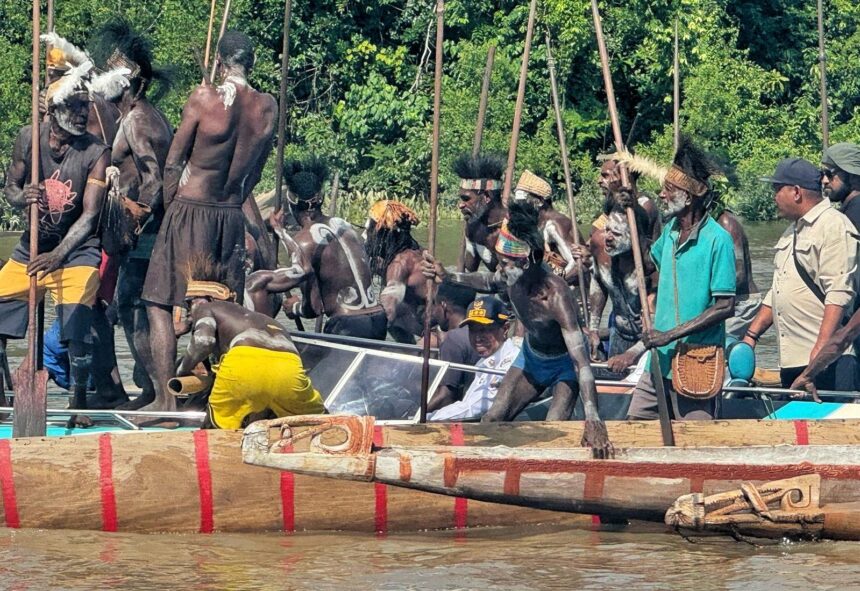 Setibanya di lokasi, puluhan warga telah menunggu dengan perahu-perahu panjang khas Asmat. Mereka berdiri di atas perahu masing-masing dengan dayung di tangan, menyambut kedatangan gubernur dan rombongan secara adat. Penyambutan berlangsung khidmat dan penuh antusiasme.
