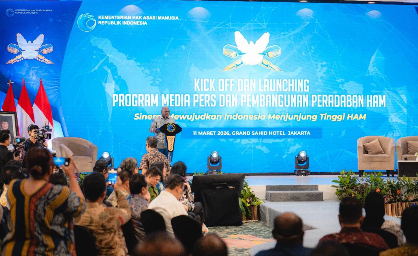 Oleh karena itulah, pemerintah berkehendak untuk senantiasa berkolaborasi dengan media massa untuk membangun kesadaran masyarakat terhadap nilai-nilai HAM sekaligus memperkuat praktik demokrasi. Menteri HAM Natalius Pigai mengungkapkan hal itu saat memberikan paparan dalam acara Kick Off dan Lauching Progam Media Pers dan Pembangunan Hak Asasi Manusia di Indonesia, Rabu (11/3/2026), di Sahid Jaya, Jakarta