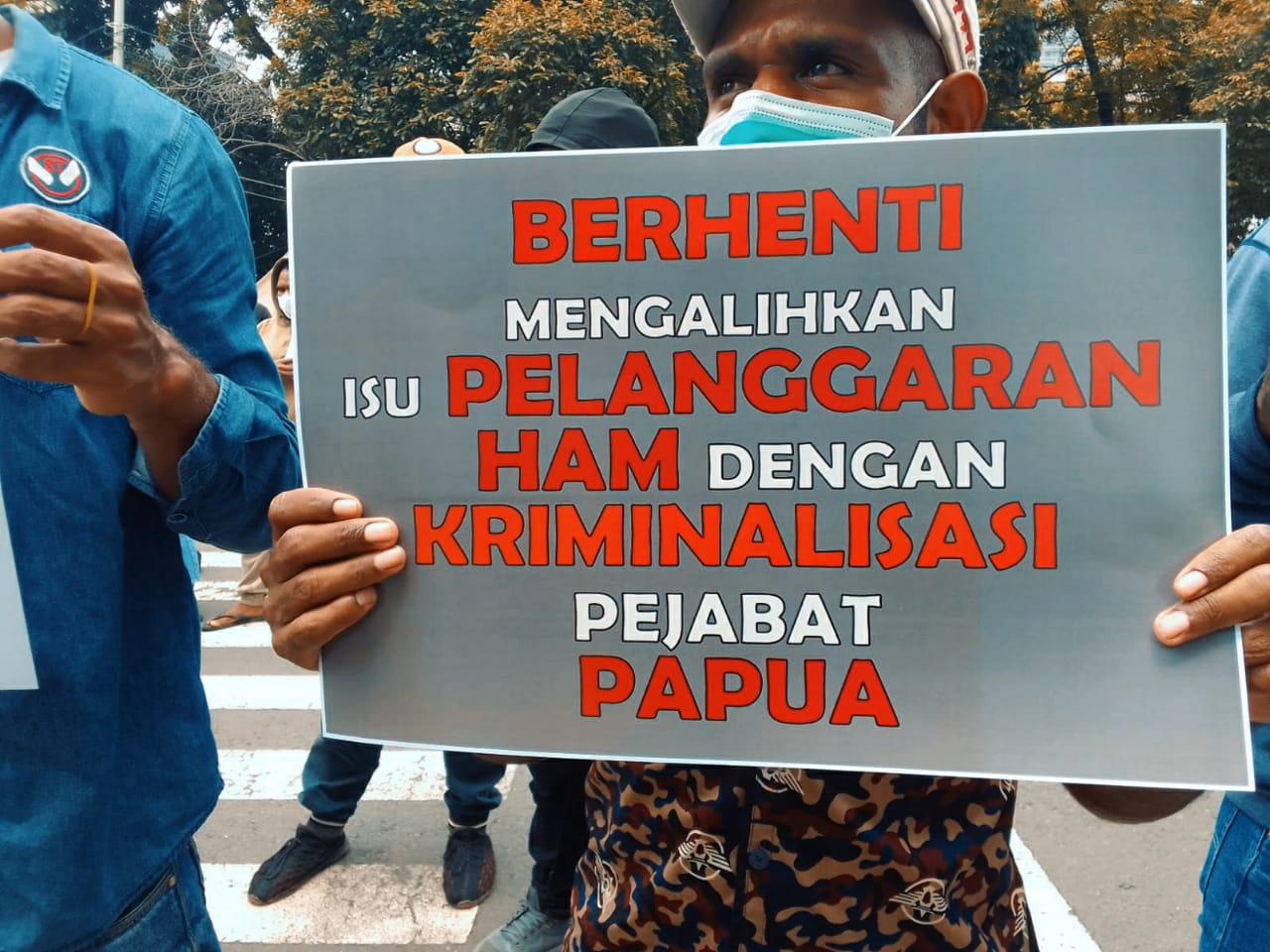 Di Gedung Dwiwarna KPK, demonstrasi tersebut dimulai sekitar pukul 10.35 WIB. Mereka turut membentangkan banner bertuliskan ‘KPK Stop Kriminalisasi Gubernur Papua’. Wajah Lukas Enembe terpampang dalam banner dimaksud. Beberapa peserta aksi turut memegang poster dengan bunyi pesan serupa.