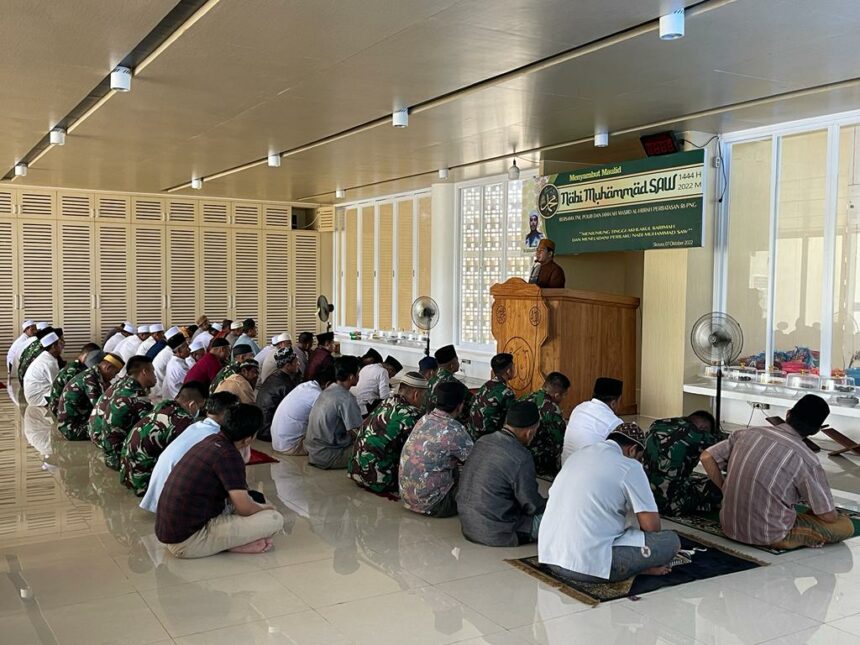 Tiffanews.co.id, Muara Tami – Satgas Pamtas RI-PNG Yonif 711/Rks Brigif 22/OM bersama masyarakat memperingati Maulid Nabi Muhammad SAW 1444 H / 2022 M dengan tema ‘Menjunjung Tinggi Akhlakul Karimah dan Meneladani Perilaku Nabi Muhammad SAW’, bertempat di Masjid Al-Hijrah, Kampung Skouw Sae, Distrik Muara Tami, Kota Jayapura, Papua, Senin (10/10/2022).