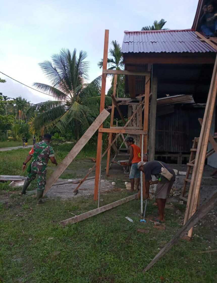 Babinsa Serda Akbar melaksanakan monitoring wilayah dilanjutkan dengan kegiatan membantu atau bersama warga membuat rumah warga desa binaan yaitu bapak zet warga Subu yang berdomisili di kampung masep.