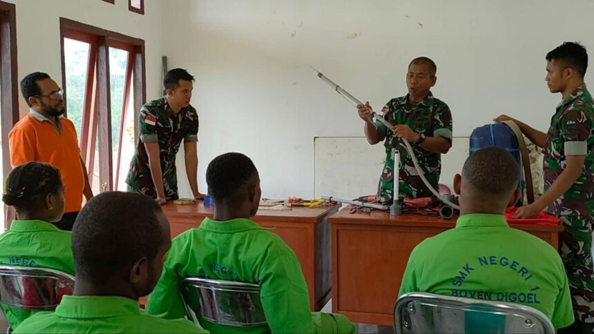 Tiffanews.co.id, Boven Digoel – Perwira Seksi Teritorial (Pasi Ter) Kodim 1711/BVD Kapten Inf Warsito memberikan materi pembuatan alat pertanian yakni inovasi tabur dan kocor pupuk pertanian kepada Siswa-siswi SMK Negeri 1 Boven Digoel, bertempat di Balai Penyuluhan Pertanian Dohnafia, Kampung Persatuan Distrik Mandobo Kabupaten Boven Digoel, Sabtu (15/10/2022).